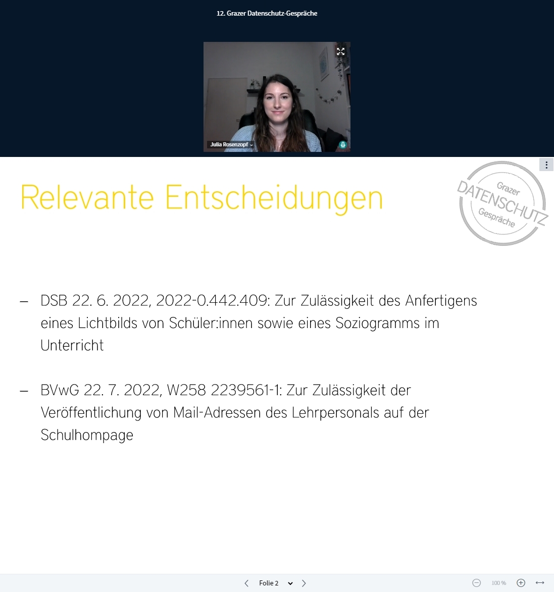 Zwei rezente Entscheidungen der DSB sowie des BVwG befassen sich mit Verarbeitungstätigkeiten personenbezogener Daten von Schüler:innen und Lehrkräften. So fertigte in einem Fall eine Lehrerin anhand von Schüler-Fragebögen zum Klassenklima ein Soziogramm an, um einen Sitzplan nach Freundschaftskonstellationen für die Schulkinder zu erstellen. Des Weiteren übermittelte sie ein mittels Handykamera aufgenommenes Lichtbild eines Schülers im Rahmen einer Schulexkursion via WhatsApp an dessen Mutter, um dieser gegenüber – aufgrund zeitlich vorgelagerter Uneinigkeiten – nachzuweisen, dass der Schüler genügend Zeit zur Essenseinnahme habe. In einem anderen Fall beschwerte sich ein Lehrer wegen der Veröffentlichung seines Namens und seiner dienstlichen E-Mail-Adresse auf der Schulwebsite. Diese zwei Fälle sollen exemplarisch für viele datenschutzrechtliche Fragestellungen, die im Schulalltag sowie der Schulorganisation zu Tage treten, genannt sein, um die Schnittstelle von Datenschutzrecht und Schule im Rahmen der 12. Ausgabe der Grazer Datenschutz-Gespräche ausführlich zu diskutieren.