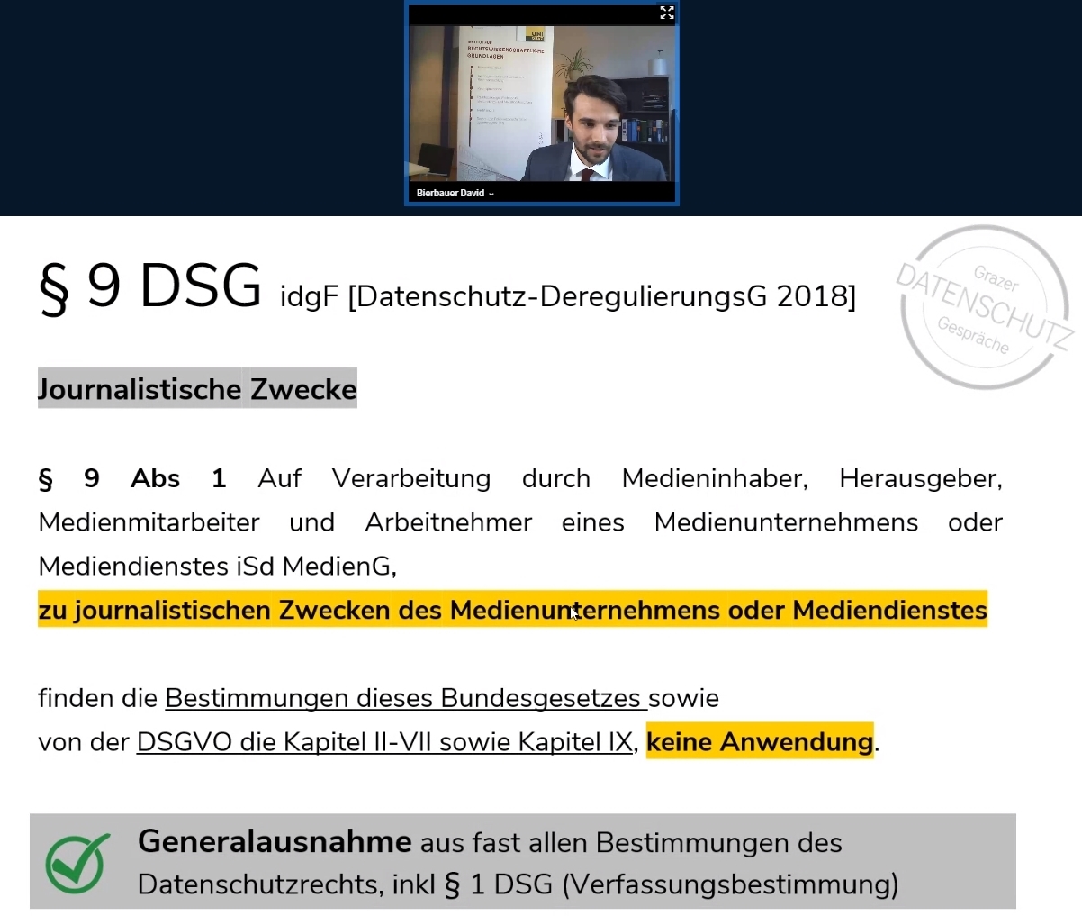 Die digitalisierte Medienwelt mit all ihren Ausprägungen – darunter etwa auch Bürgerjournalismus, Bewertungsplattformen, Influencer – lebt von fundamentalen Rechtspositionen wie der freien Meinungsäußerung sowie Informationsfreiheit und hat dabei stets andere grundrechtliche Gewährleistungen wie etwa den Schutz personenbezogener Daten von betroffenen Personen im Blick zu halten. Die 10. Ausgabe der Datenschutz-Gespräche thematisiert daher diese Schnittstelle zwischen Meinungsäußerungsfreiheit und Datenschutz und befasst sich mit der Reichweite des sog „Medienprivilegs“ der DSGVO sowie der nationalen Regelung des § 9 DSG.